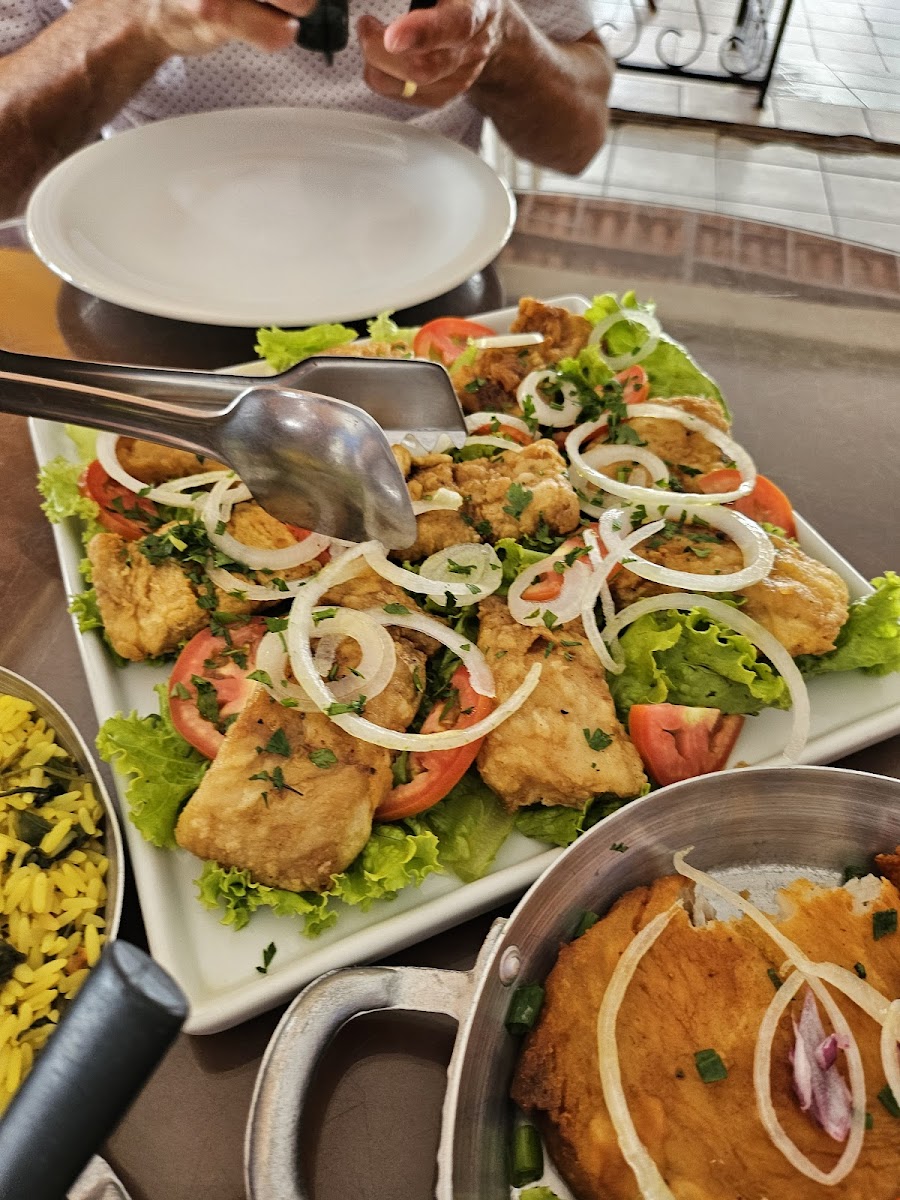 One of the standout dishes at Terraço Caicoense is the Peixe Frito Pescada Amarela, a perfectly fried yellow fish that captures the essence of Brazil’s coastal cuisine. The fish is crispy on the outside, tender on the inside, and seasoned to perfection. Paired with a side of rice and beans, it’s a true taste of the region’s flavors. Another highlight is the Pastel de Carne de Sol, a savory pastry filled with sun-dried beef that offers a delightful blend of textures and tastes. This dish is perfect for a quick snack or as a starter to share with friends.